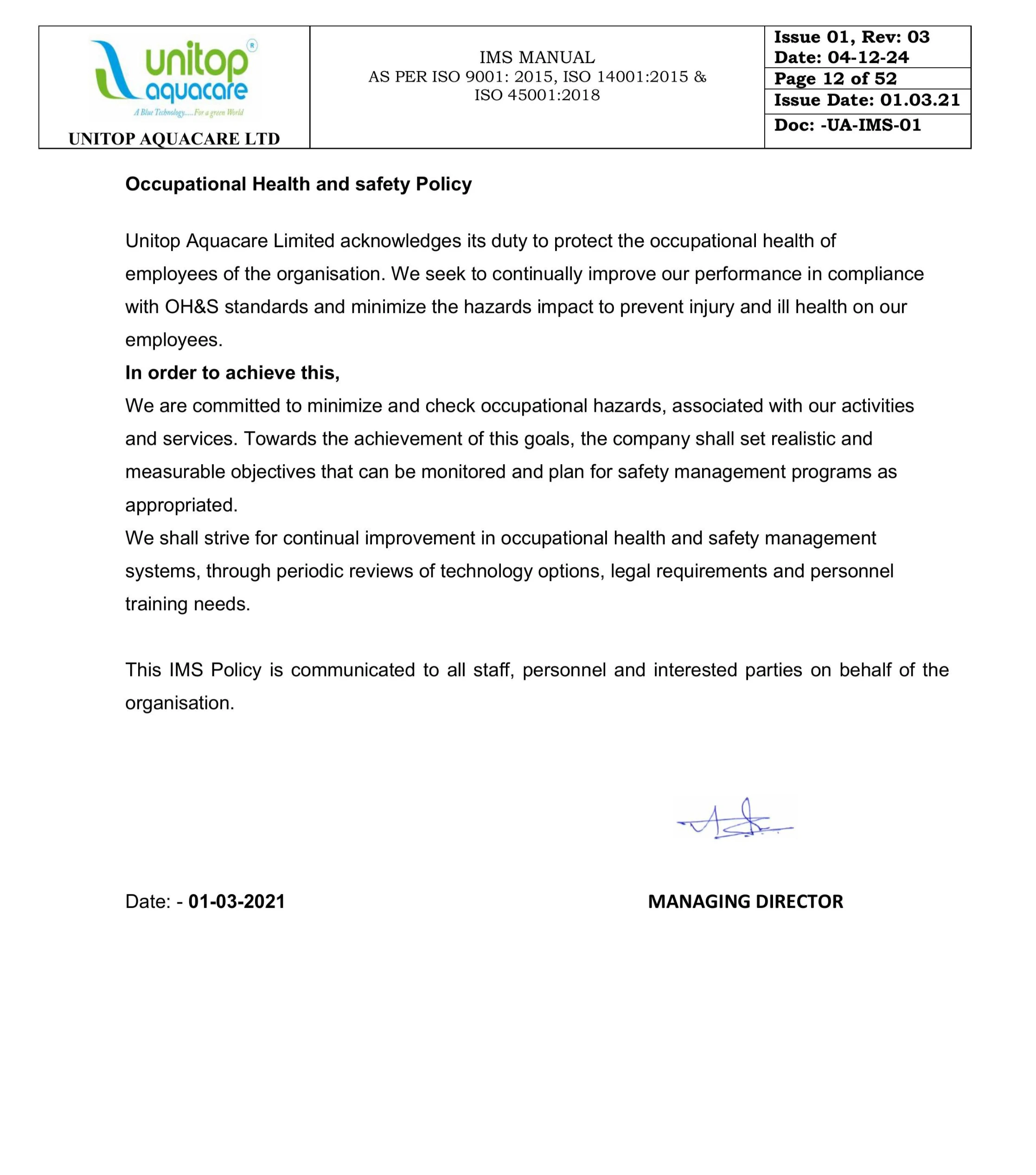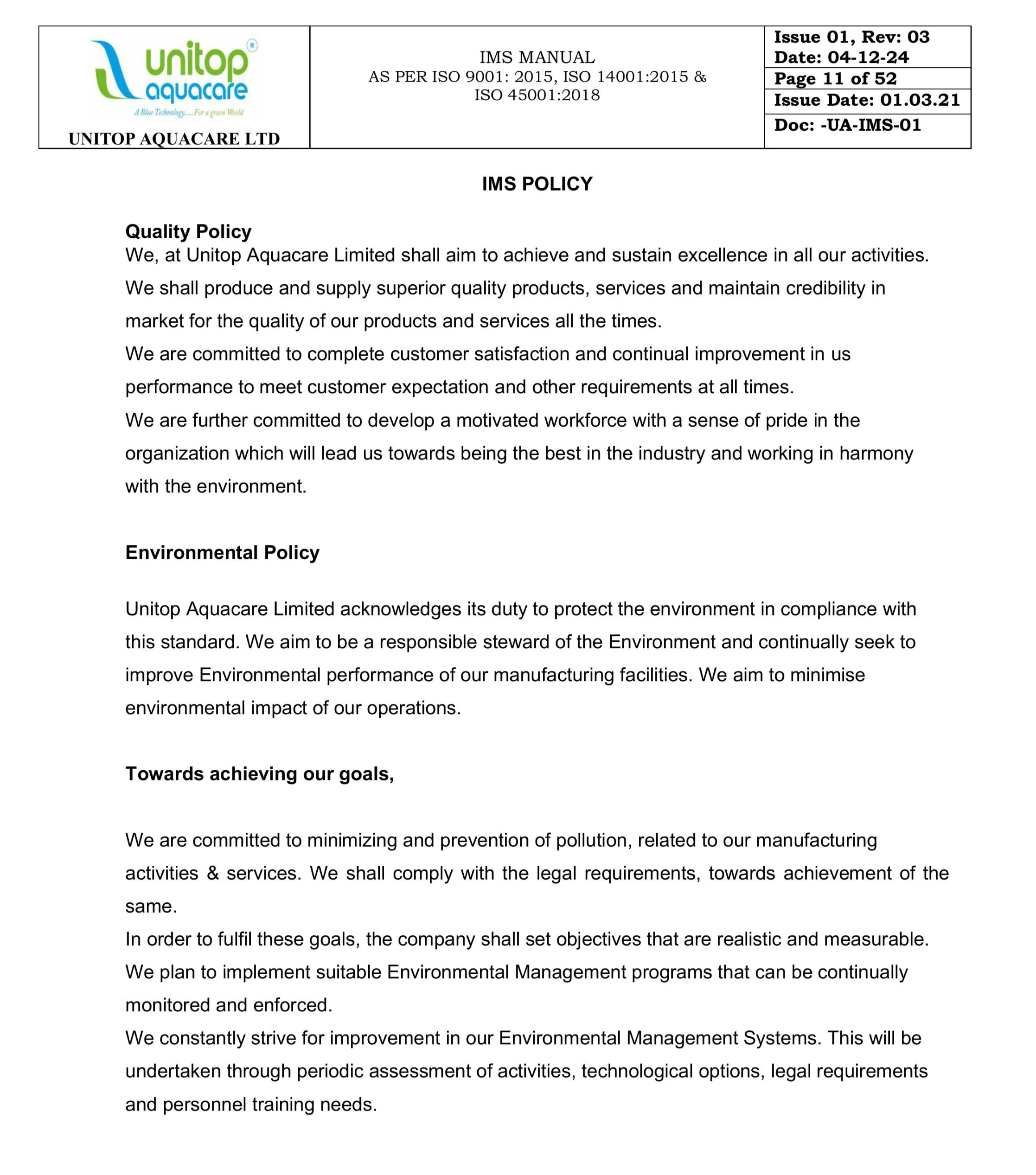 Unitop Aquacare is a group company of Unitop Group, having presence and experience over 4 decades in providing engineering services across the world. We are certified with the certifications like ISO 9001:2015, 14001:2015 & 45001:2018 For India, CE Certified For Europe, SELO For China, NR 13 For South America & EAC For Russia which are required for the exporting the machines.